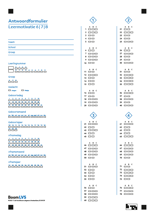 Dit product bevat een set van 25 antwoordformulieren voor deze vragenlijst. Deze formulieren worden door Boom test onderwijs verwerkt en kunnen niet online worden genormeerd. Leermotivatie 6-7-8 kan wel volledig online worden afgenomen in het Boom testcentrum. Hiervoor dien je credits aan te schaffen. Om de vragenlijst af te nemen dien je ook over de basisset van Leermotivatie 6-7-8 te beschikken.
