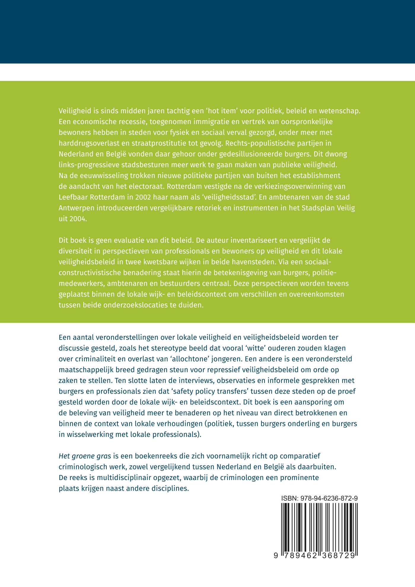 Dit boek is geen evaluatie van dit beleid. De auteur inventariseert en vergelijkt de diversiteit in perspectieven van professionals en bewoners op veiligheid en dit lokale veiligheidsbeleid in twee kwetsbare wijken in beide havensteden. Via een sociaalconstructivistische benadering staat hierin de betekenisgeving van burgers, politiemedewerkers, ambtenaren en bestuurders centraal. Deze perspectieven worden tevens geplaatst binnen de lokale wijk- en beleidscontext om verschillen en overeenkomsten tussen beide onderzoekslocaties te duiden.