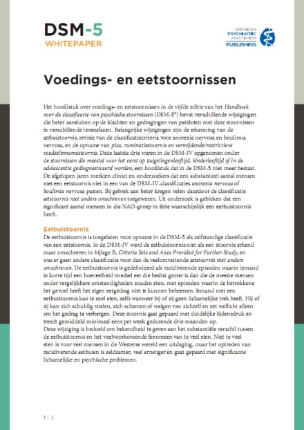 Het hoofdstuk over voedings- en eetstoornissen in de vijfde editie van het Handboek voor de classificatie van psychische stoornissen (DSM-5®) bevat verschillende wijzigingen die beter aansluiten op de klachten en gedragingen van patiënten met deze stoornissen in verschillende levensfasen.