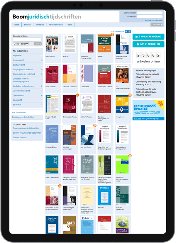 De online tijdschriftenportal van Boom juridisch bevat bijna 50 juridisch-wetenschappelijke tijdschriften en ruim 21.000 wetenschappelijke artikelen voor het juridisch en criminologisch vakgebied. De praktische en wetenschappelijke artikelen komen tot stand door nauwe samenwerking van toonaangevende auteurs en ervaren redacties. Zij waarborgen een hoge mate van kwaliteit.