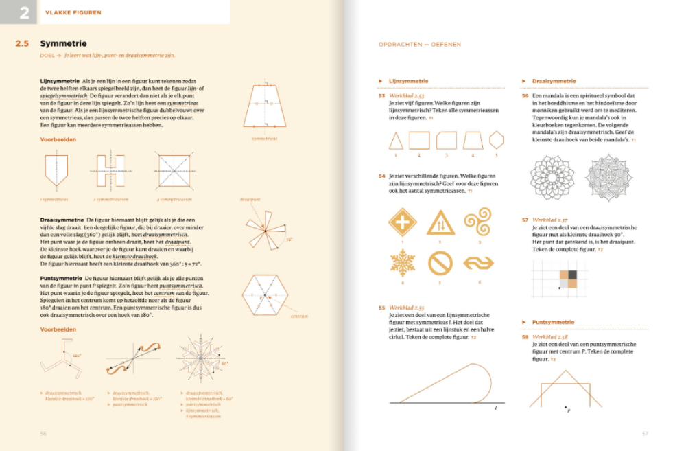 Ieder hoofdstuk opent met ‘Academie’ waarin onderwerpen als kunst, cultuur en wetenschap worden belicht vanuit een wiskundig perspectief. Daarna volgen vijf paragrafen. Elke paragraaf bevat uitleg van enkele wiskundige concepten, opdrachten om te oefenen en aan het eind extra uitdaging in ‘Ontdekken en onderzoeken’. Elk hoofdstuk sluit af met een voorbereiding op de toets.