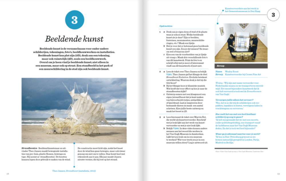 De elf dimensies komen elk in een afzonderlijk hoofdstuk aan de orde, steeds met heldere uitleg en sprekende voorbeelden uit verschillende kunstdisciplines. Ieder hoofdstuk kent een vaste structuur en eindigt met een serie opdrachten. Acht hoofdstukken over de kunstdisciplines bieden de leerlingen een elementaire basis en een goede voorbereiding op culturele activiteiten. De vier domeinen (Verkennen, Verbreden, Verdiepen en Verbinden) structureren de hele methode en zijn de kapstokken voor de opdrachten in de dimensie- en disciplinehoofdstukken. Daarnaast zijn er drie meer ‘ondersteunende’ hoofdstukken over onderzoeken, presenteren en reflecteren. Ze geven leerlingen houvast bij de nieuwe vaardigheden die ze nodig hebben bij de uitvoering van de verdiepende en verbindende opdrachten.