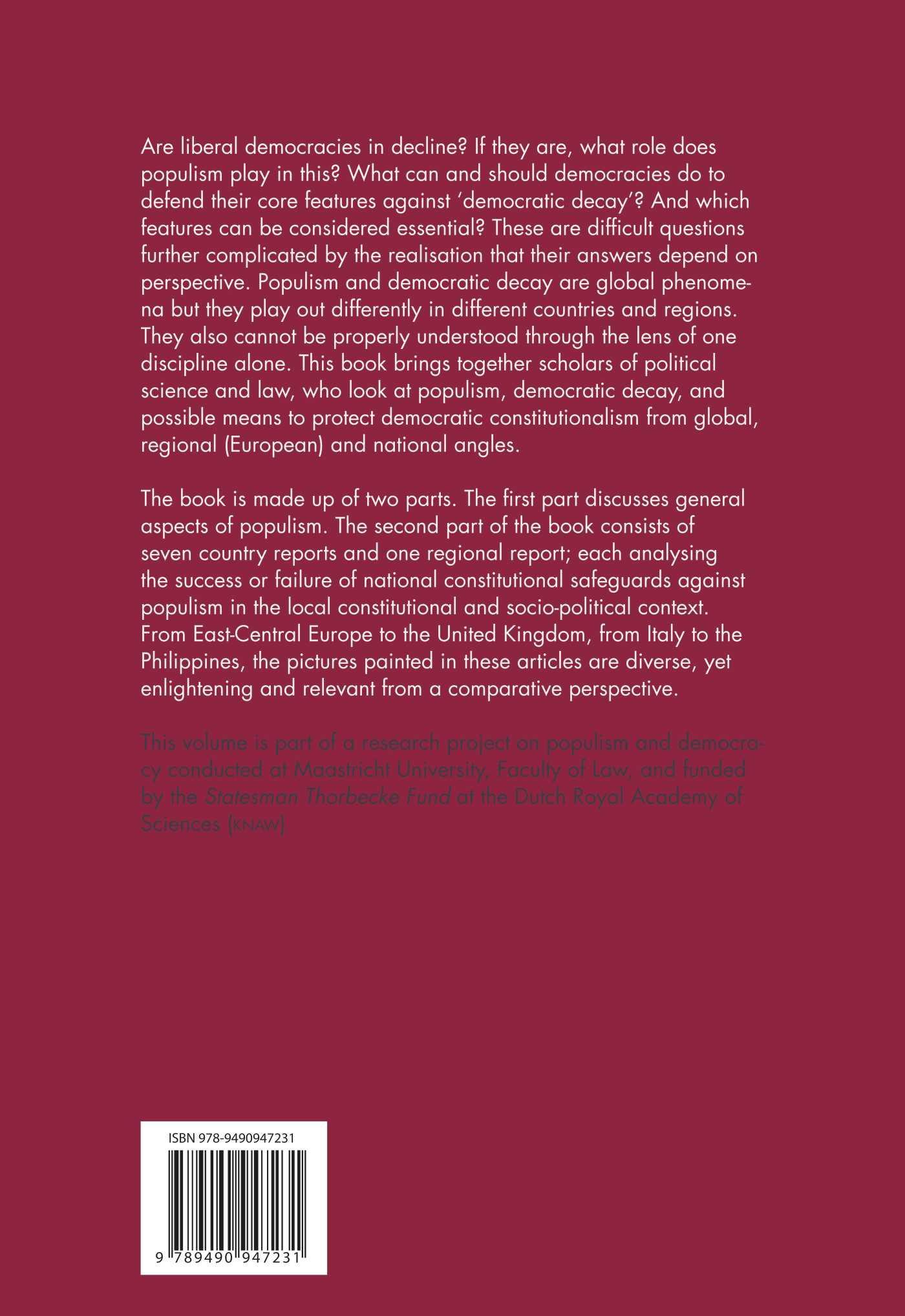 This volume is part of a research project on populism and democracy conducted at Maastricht University, Faculty of Law, and funded by the Statesman Thorbecke Fund at the Dutch Royal Academy of Sciences (knaw).