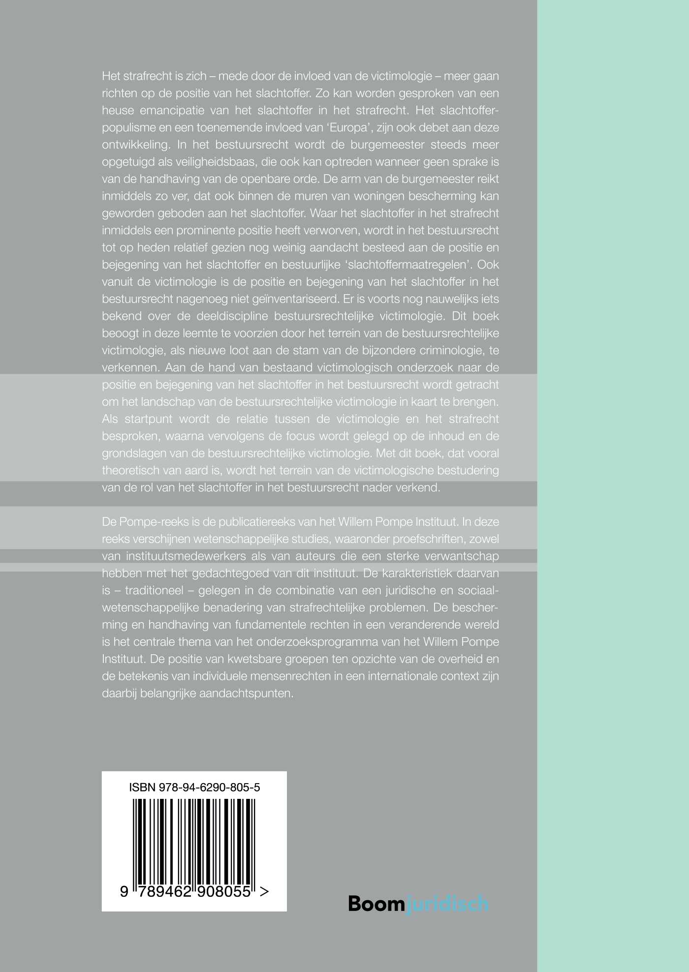 Het strafrecht is zich – mede door de invloed van de victimologie – meer gaan richten op de positie van het slachtoffer. Zo kan worden gesproken van een heuse emancipatie van het slachtoffer in het strafrecht. Het slachtofferpopulisme en een toenemende invloed van ‘Europa’, zijn ook debet aan deze ontwikkeling. In het bestuursrecht wordt de burgemeester steeds meer opgetuigd als veiligheidsbaas, die ook kan optreden wanneer geen sprake is van de handhaving van de openbare orde. De arm van de burgemeester reikt inmiddels zo ver, dat ook binnen de muren van woningen bescherming kan geworden geboden aan het slachtoffer. Waar het slachtoffer in het strafrecht inmiddels een prominente positie heeft verworven, wordt in het bestuursrecht tot op heden relatief gezien nog weinig aandacht besteed aan de positie en bejegening van het slachtoffer en bestuurlijke ‘slachtoffermaatregelen’. Ook vanuit de victimologie is de positie en bejegening van het slachtoffer in het bestuursrecht nagenoeg niet geïnventariseerd. Er is voorts nog nauwelijks iets bekend over de deeldiscipline bestuursrechtelijke victimologie. Dit boek beoogt in deze leemte te voorzien door het terrein van de bestuursrechtelijke victimologie, als nieuwe loot aan de stam van de bijzondere criminologie, te verkennen. Aan de hand van bestaand victimologisch onderzoek naar de positie en bejegening van het slachtoffer in het bestuursrecht wordt getracht om het landschap van de bestuursrechtelijke victimologie in kaart te brengen. Als startpunt wordt de relatie tussen de victimologie en het strafrecht besproken, waarna vervolgens de focus wordt gelegd op de inhoud en de grondslagen van de bestuursrechtelijke victimologie. Met dit boek, dat vooral theoretisch van aard is, wordt het terrein van de victimologische bestudering van de rol van het slachtoffer in het bestuursrecht nader verkend.