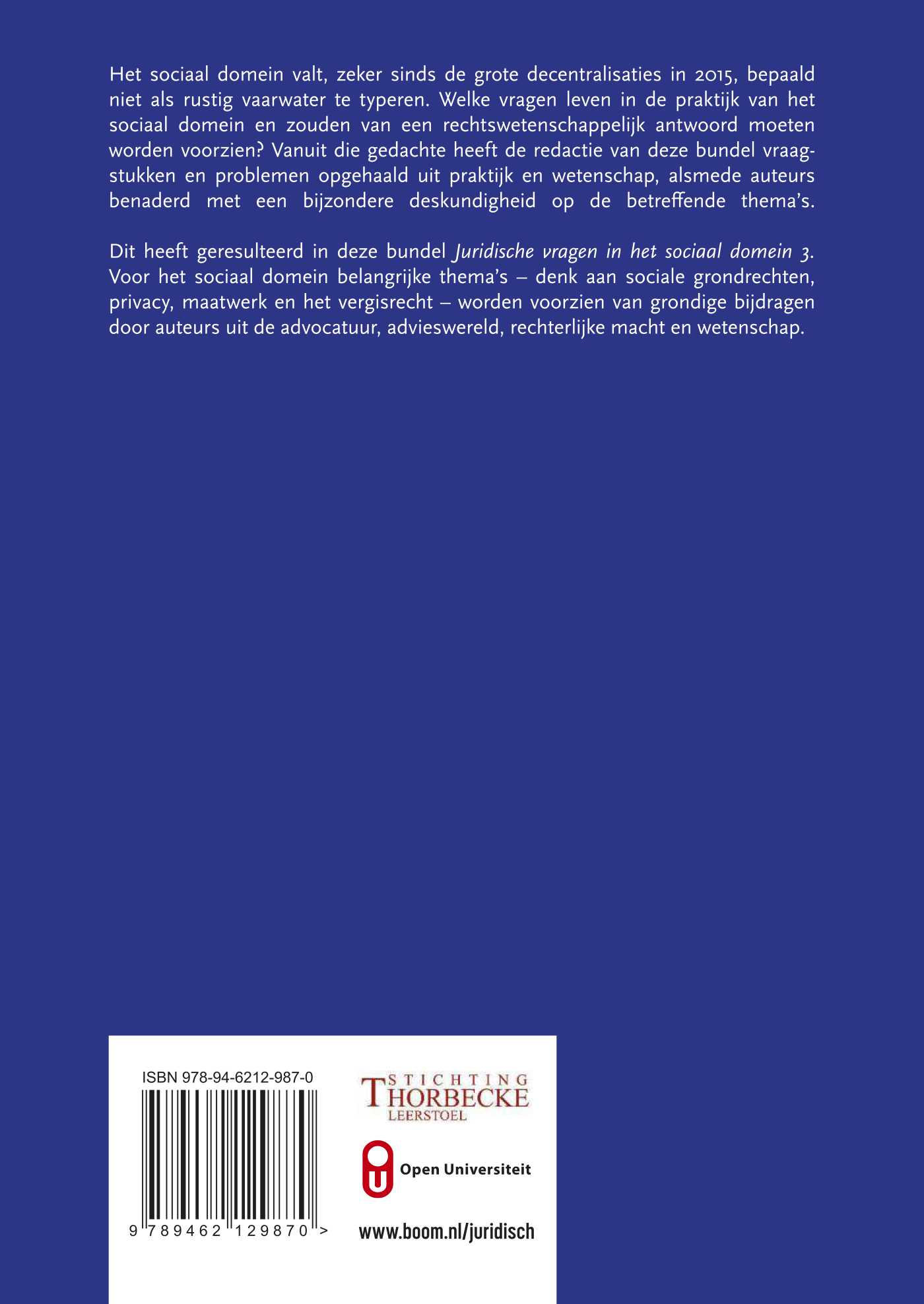 Dit heeft geresulteerd in deze bundel Juridische vragen in het sociaal domein 3. Voor het sociaal domein belangrijke thema’s – denk aan sociale grondrechten, privacy, maatwerk en het vergisrecht – worden voorzien van grondige bijdragen door auteurs uit de advocatuur, advieswereld, rechterlijke macht en wetenschap.