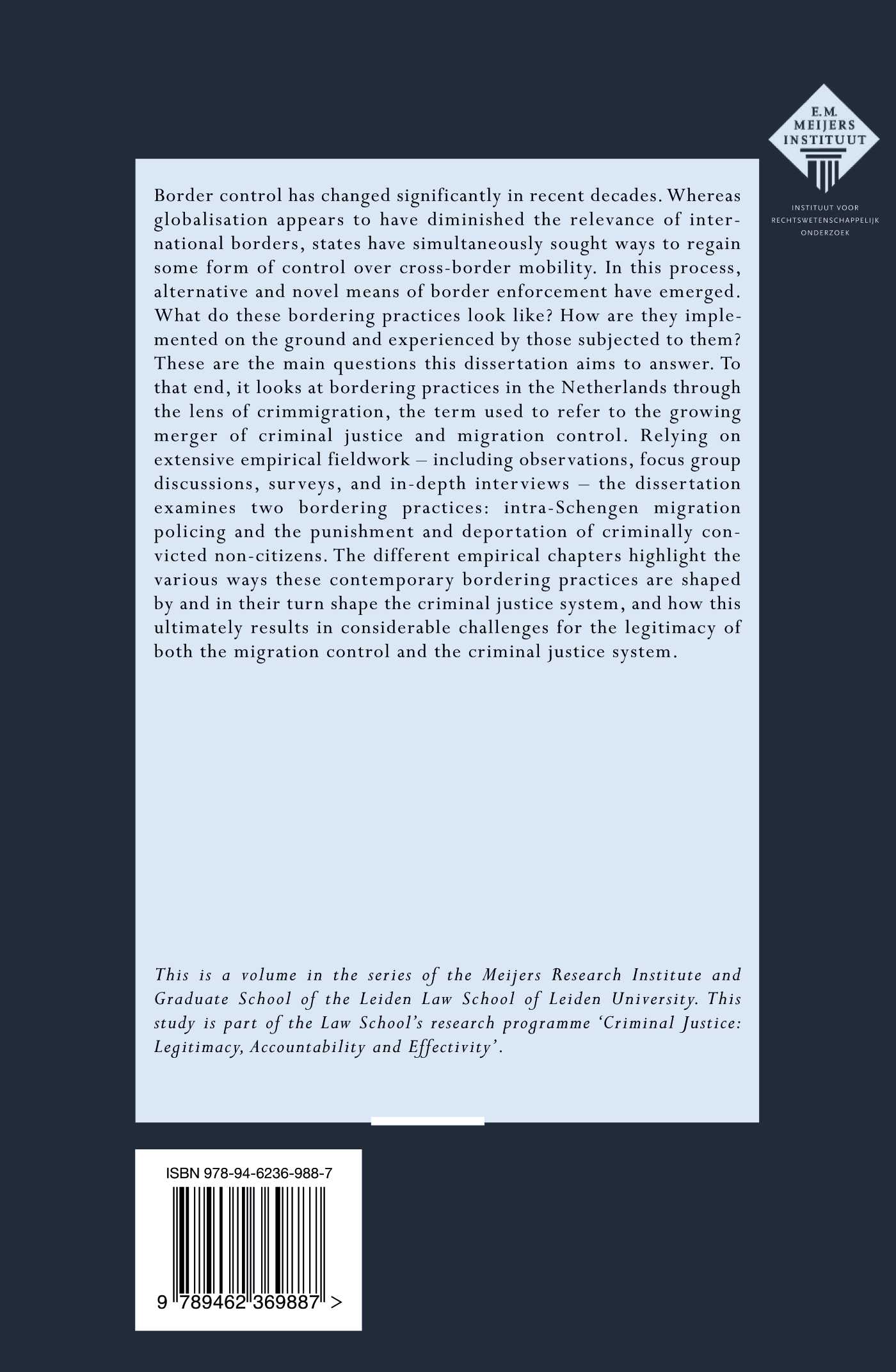 Border control has changed significantly in recent decades. Whereas globalisation appears to have diminished the relevance of international borders, states have simultaneously sought ways to regain some form of control over cross-border mobility. In this process, alternative and novel means of border enforcement have emerged. What do these bordering practices look like? How are they implemented on the ground and experienced by those subjected to them? These are the main questions this dissertation aims to answer. To that end, it looks at bordering practices in the Netherlands through the lens of crimmigration, the term used to refer to the growing merger of criminal justice and migration control. Relying on extensive empirical fieldwork – including observations, focus group discussions, surveys, and in-depth interviews – the dissertation examines two bordering practices: intra-Schengen migration policing and the punishment and deportation of criminally convicted non-citizens. The different empirical chapters highlight the various ways these contemporary bordering practices are shaped by and in their turn shape the criminal justice system, and how this ultimately results in considerable challenges for the legitimacy of both the migration control and the criminal justice system.