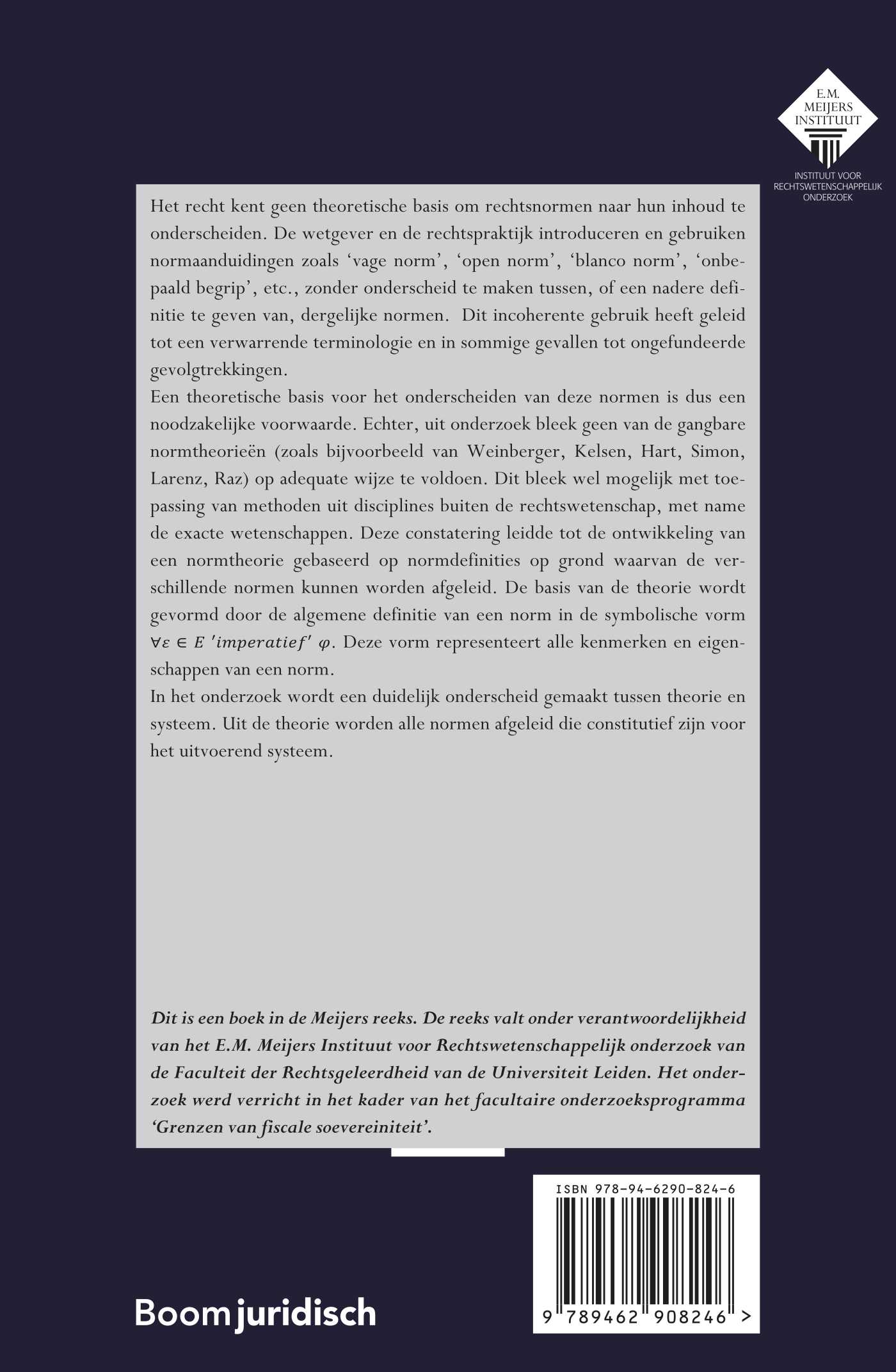 Het recht kent geen theoretische basis om rechtsnormen naar hun inhoud te onderscheiden. De wetgever en de rechtspraktijk introduceren en gebruiken normaanduidingen zoals ‘vage norm’, ‘open norm’, ‘blanco norm’, ‘onbepaald begrip’, etc., zonder onderscheid te maken tussen, of een nadere definitie te geven van, dergelijke normen. Dit incoherente gebruik heeft geleid tot een verwarrende terminologie en in sommige gevallen tot ongefundeerde gevolgtrekkingen. Een theoretische basis voor het onderscheiden van deze normen is dus een noodzakelijke voorwaarde. Echter, uit onderzoek bleek geen van de gangbare normtheorieën (zoals bijvoorbeeld van Weinberger, Kelsen, Hart, Simon, Larenz, Raz) op adequate wijze te voldoen. Dit bleek wel mogelijk met toepassing van methoden uit disciplines buiten de rechtswetenschap, met name de exacte wetenschappen. Deze constatering leidde tot de ontwikkeling van een normtheorie gebaseerd op normdefinities op grond waarvan de verschillende normen kunnen worden afgeleid. De basis van de theorie wordt gevormd door de algemene definitie van een norm in symbolische vormen. Deze vorm representeert alle kenmerken en eigenschappen van een norm. In het onderzoek wordt een duidelijk onderscheid gemaakt tussen theorie en systeem. Uit de theorie worden alle normen afgeleid die constitutief zijn voor het uitvoerend systeem.